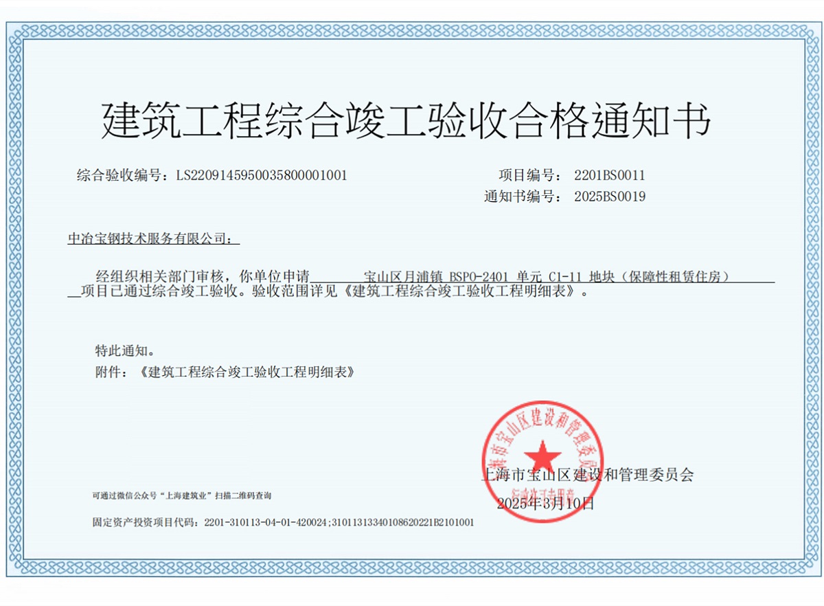 3月10日,中冶寶鋼建設(shè)的寶山區(qū)月浦鎮(zhèn)保障性租賃住房項(xiàng)目通過(guò)綜合竣工驗(yàn)收,取得“建設(shè)工程綜合竣工驗(yàn)收合格通知書”。