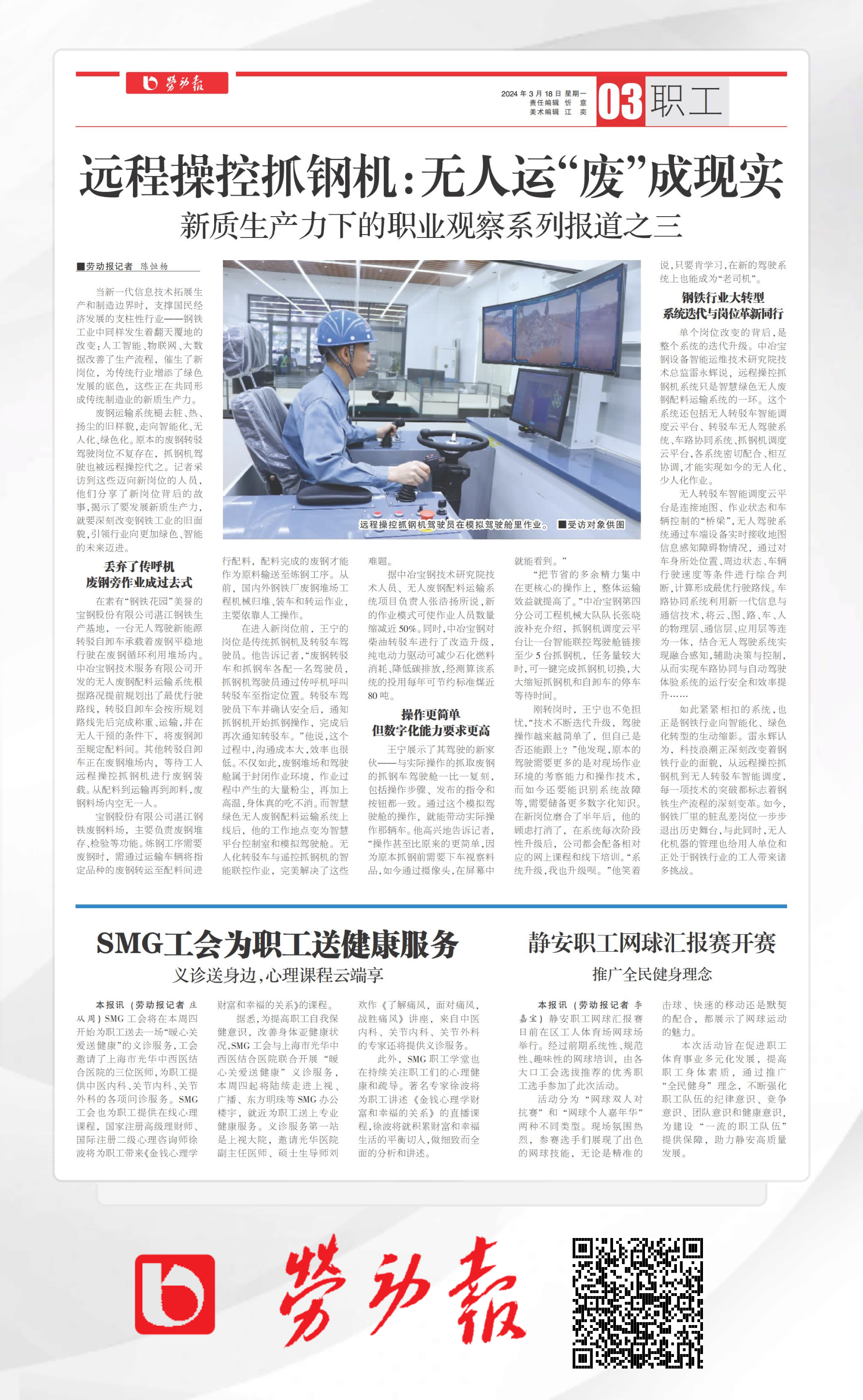 《勞動報》:新質生產力下的職業觀察系列報道之三——遠程操控抓鋼機:無人運“廢”成現實